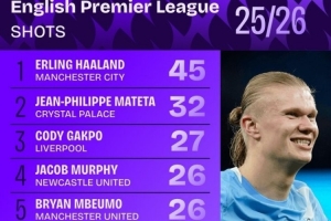 本赛季英超射门数统计:哈兰德以45次领跑,加克波、姆伯莫、萨拉赫名列其中。