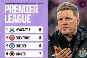 全文摘要:据Opta统计,本赛季英超球队在领先情况下丢分情况出炉。纽卡斯尔联以9分高居榜首,布伦特福德与切尔西同积8分并列次席。狼队丢7分,富勒姆与曼联丢6分。水晶宫、曼城、热刺和利兹联均丢5分,并列榜单后半段。