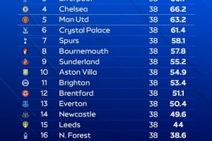 天空体育预测英超最终排名:阿森纳将夺冠,曼城位列第二,利物浦排名第三,曼联位居第五。